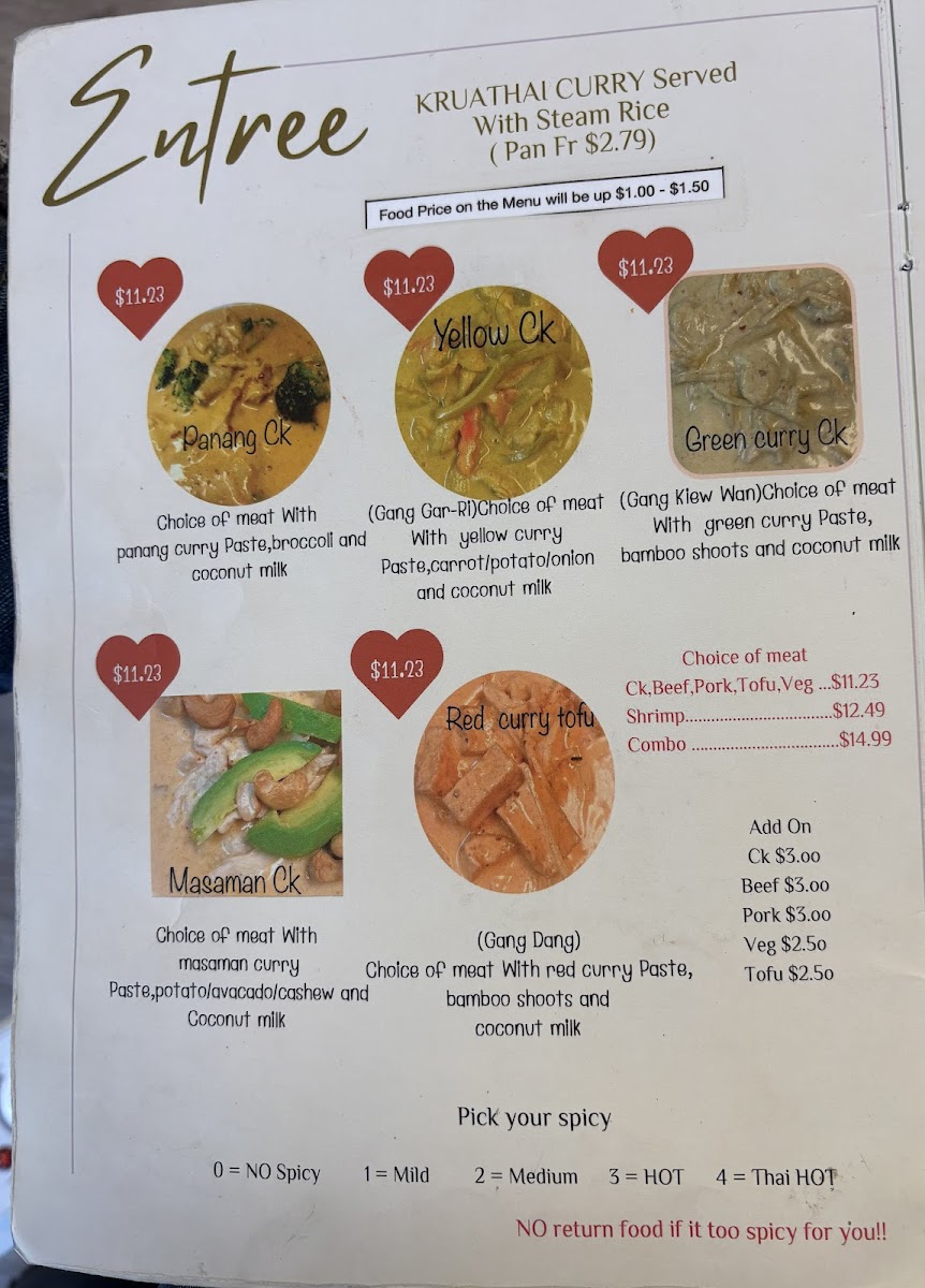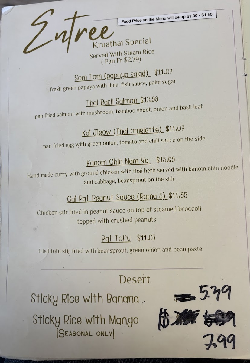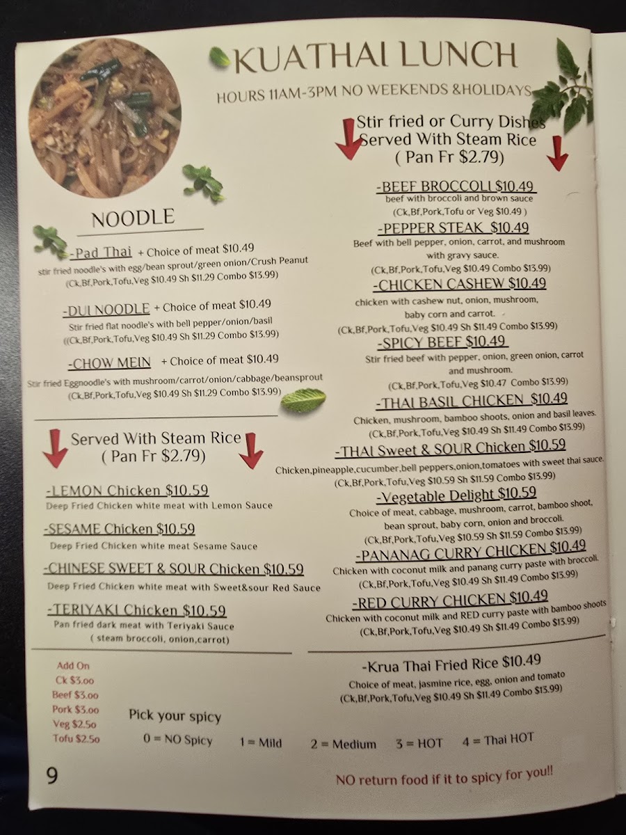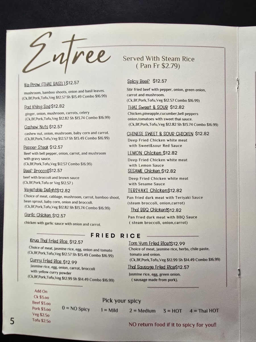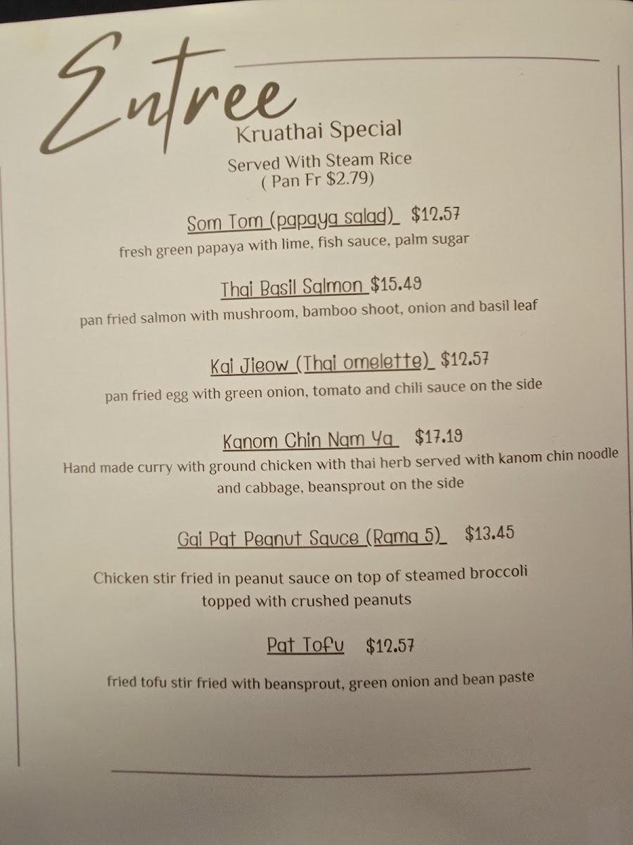 Overall, the menu reflects the warm, casual atmosphere of Krua Thai—a place where simple, well-executed Thai food is served with care, inviting diners to enjoy everyday moments over balanced and flavorful dishes.