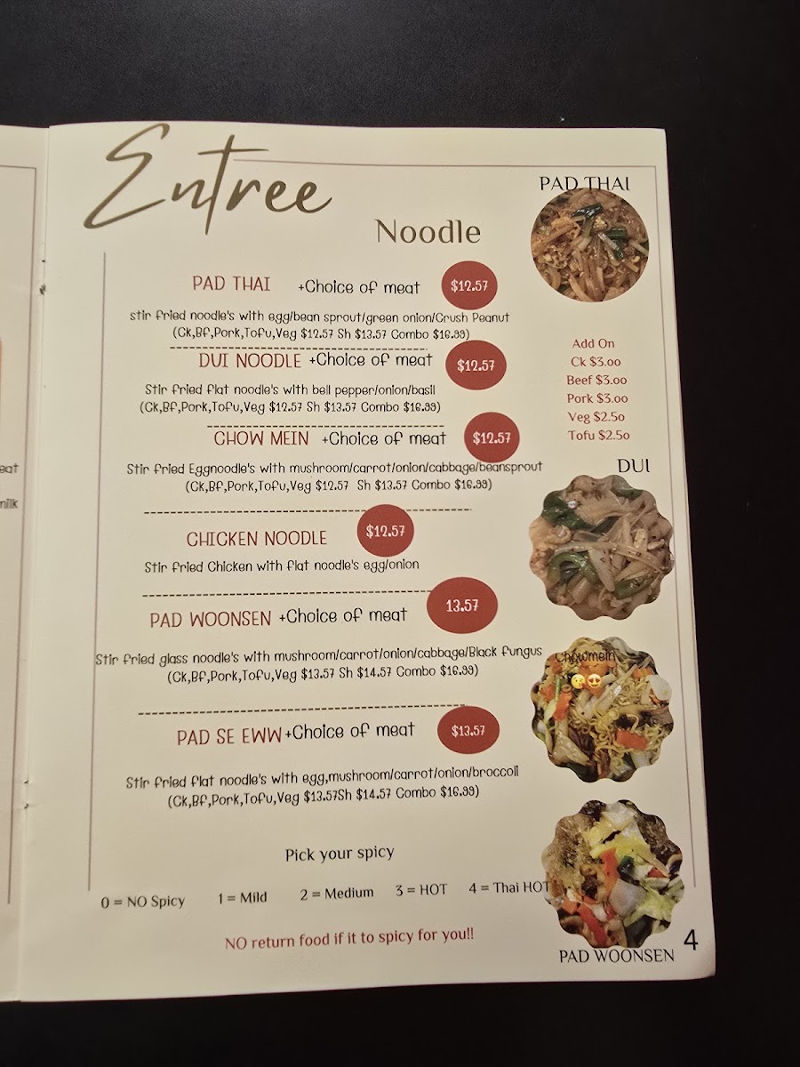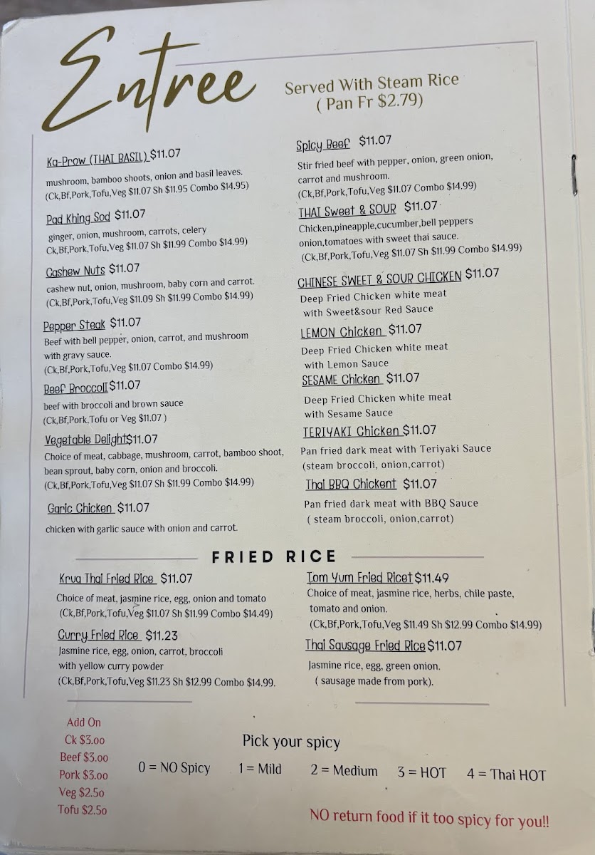 The menu at Krua Thai Restaurant offers a straightforward and approachable selection of Thai classics, perfect for those seeking comforting flavors in a relaxed setting. Whether you're stopping by for a satisfying lunch or a casual dinner, the dishes balance familiar tastes with authentic ingredients.