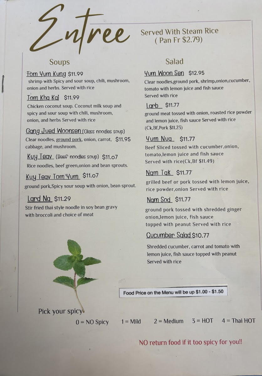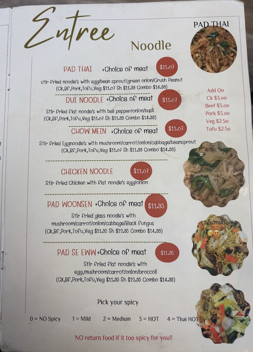 You can expect a mix of hearty noodle dishes and rich curries, such as the Massaman Curry or Panang Chicken Curry, alongside lighter options like spring rolls and chicken satay. The variety makes it easy to find something fitting for any time of day, whether you're looking for a quick bite or a more leisurely meal.
